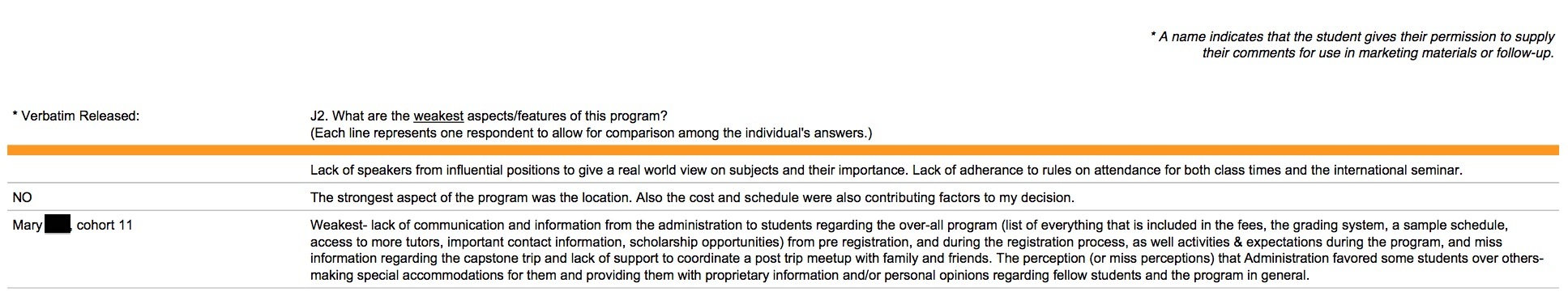 Previously, business schools participating in the MBA Lifecycle Survey Suite were provided separate reports for the verbatim responses, respondent answers to each open-ended (qualitative) question. If a respondent waives confidentiality, these comments will be identified for potential follow-up for conflict resolution or marketing testimonial.
